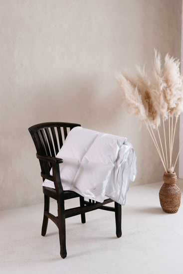 The goose down is stuffed into a shell made of 100% combed cotton with a satin-woven, completely down-proof treatment. This cotton fabric is outstandingly soft-to-the-touch. It is the only material suited to casing luxury goose down. The very high TC number gives the characteristic airiness of the textile. The optical white colour gives its surface shine.